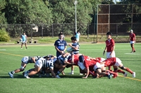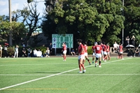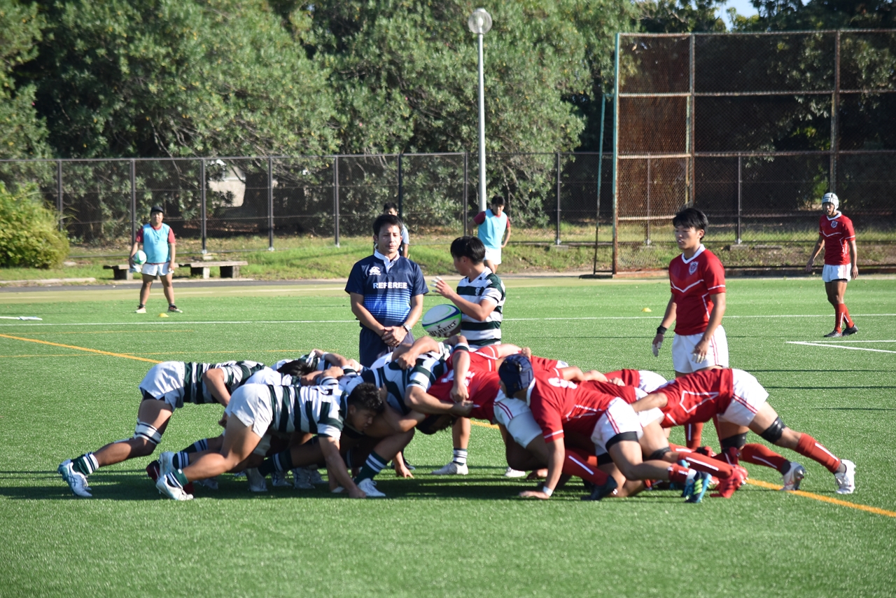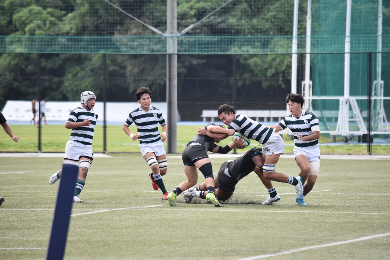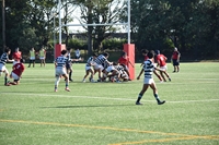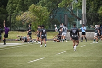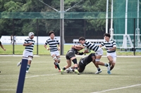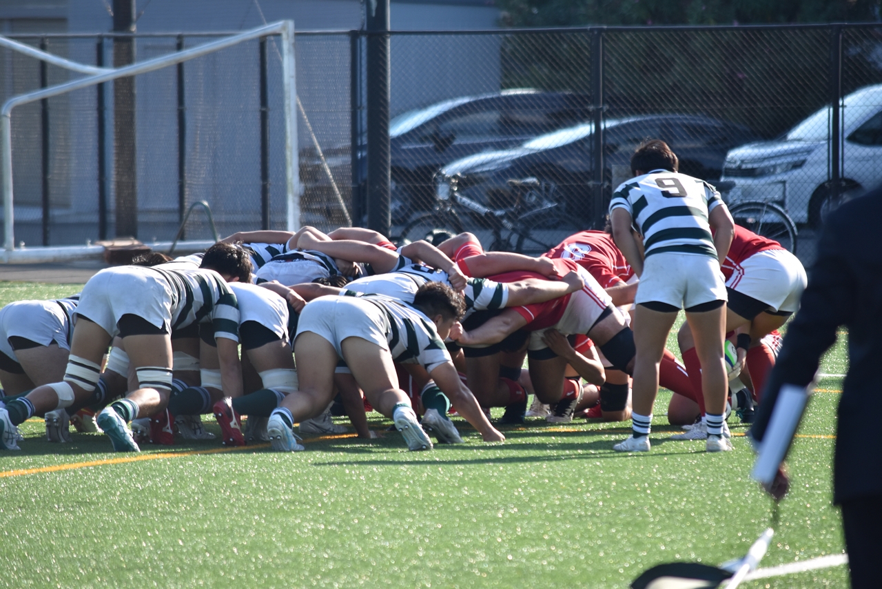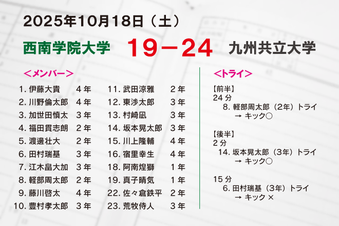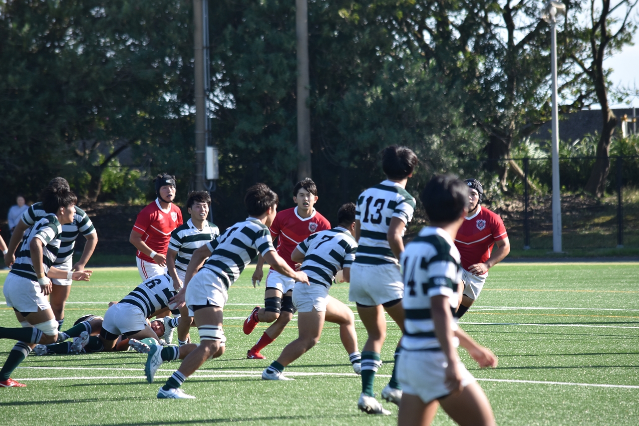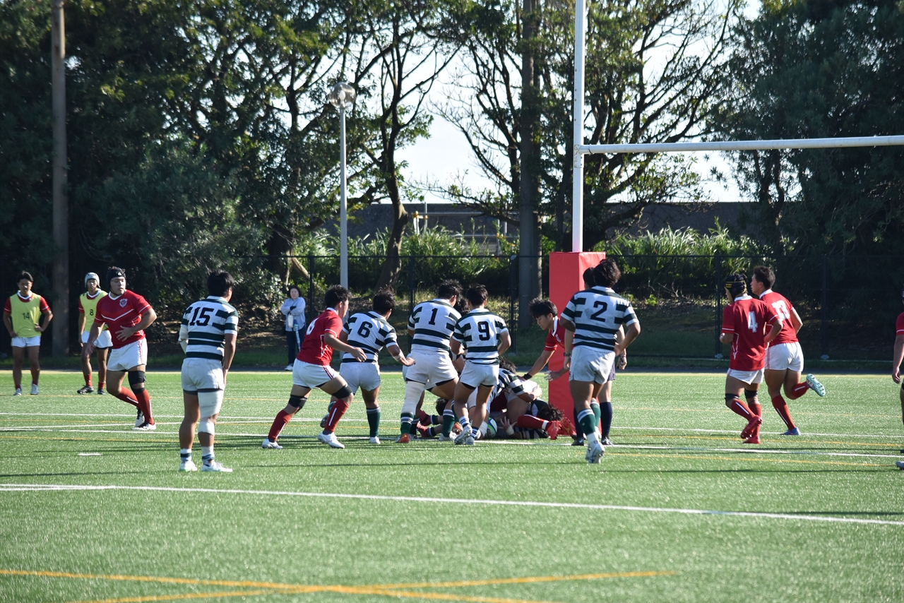 春の練習試合では大差で負けた相手であったが、試合開始間もなく相手外人センターが縦に突破し先制のトライを取られる展開、しかし西南大は相手攻撃をタックルで分断し1トライを取り返し7対17の接戦で前半を終了、後半共立大攻撃をフランカー陣の低いタックル・バックスとのダブルタックルで度々凌ぎ、FWが敵ゴール前でしつこく攻撃を繰り返し、西南大が2トライを奪い19対17で逆転に成功、川上キャプテンのキック・ランでの攻撃で陣地を取り返すものの最後は2トライを許しノーサイドとなりました。