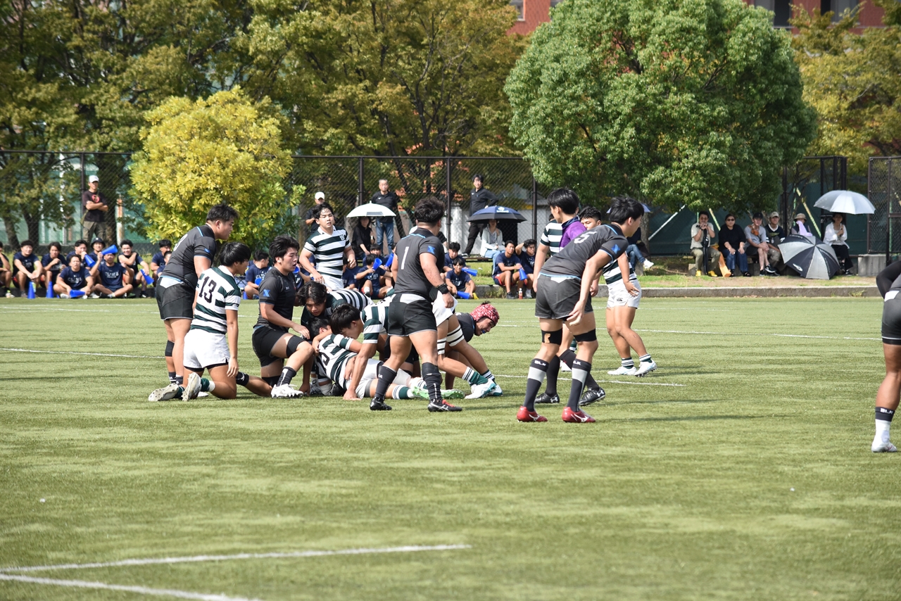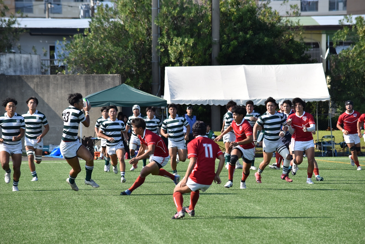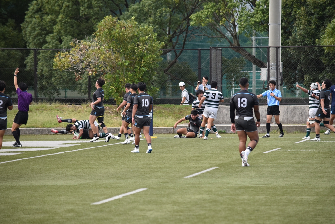 後半風上で最大限キックを利用し敵陣での試合展開を継続する中、FW・BK波状攻撃を繰り返す、後半最初の相手ゴール前スクラムでは西南が押し込みインゴールで抑えトライ、ゴールキックも成功、その後1トライ・ゴールキックと1認定トライ・ゴールキックと立て続けに得点を重ねる。