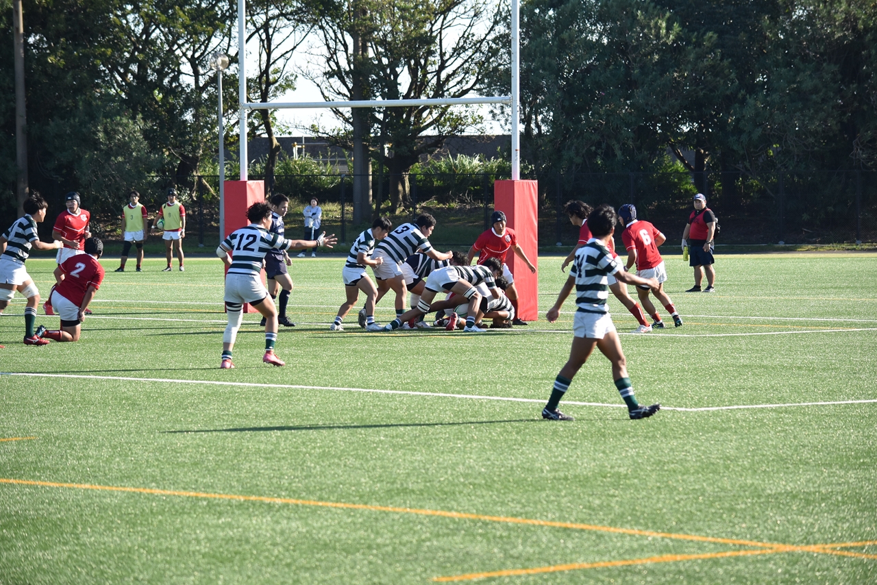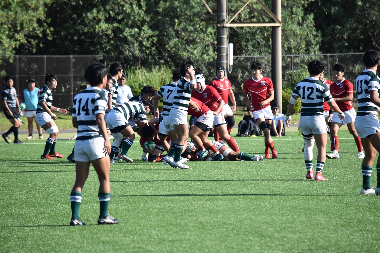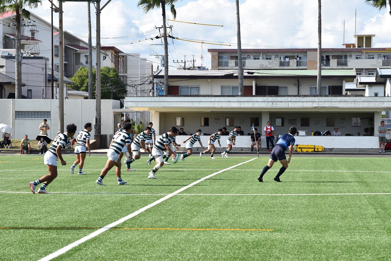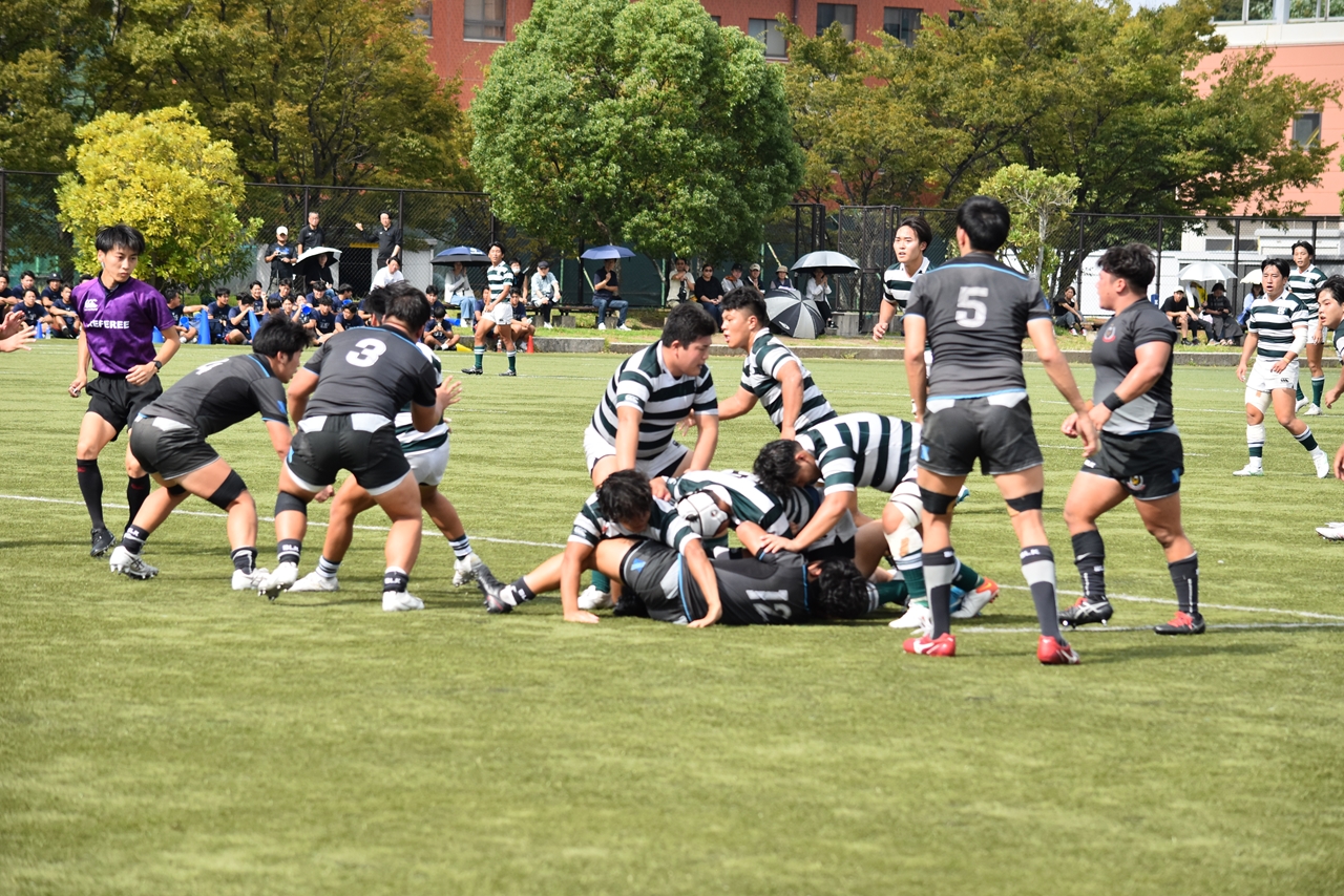 後半風上で最大限キックを利用し敵陣での試合展開を継続する中、FW・BK波状攻撃を繰り返す、後半最初の相手ゴール前スクラムでは西南が押し込みインゴールで抑えトライ、ゴールキックも成功、その後1トライ・ゴールキックと1認定トライ・ゴールキックと立て続けに得点を重ねる。