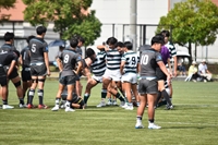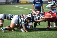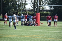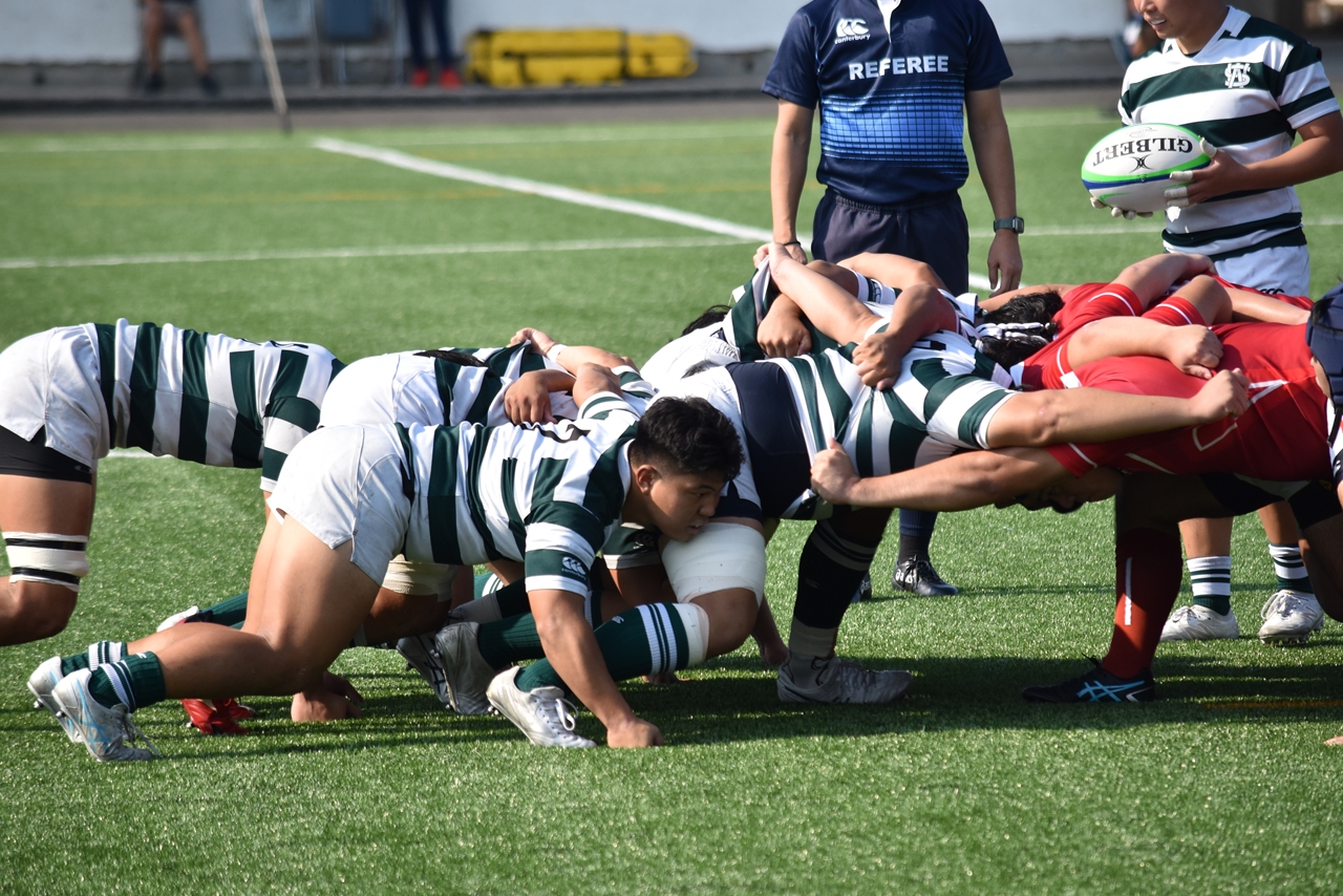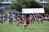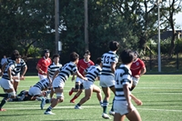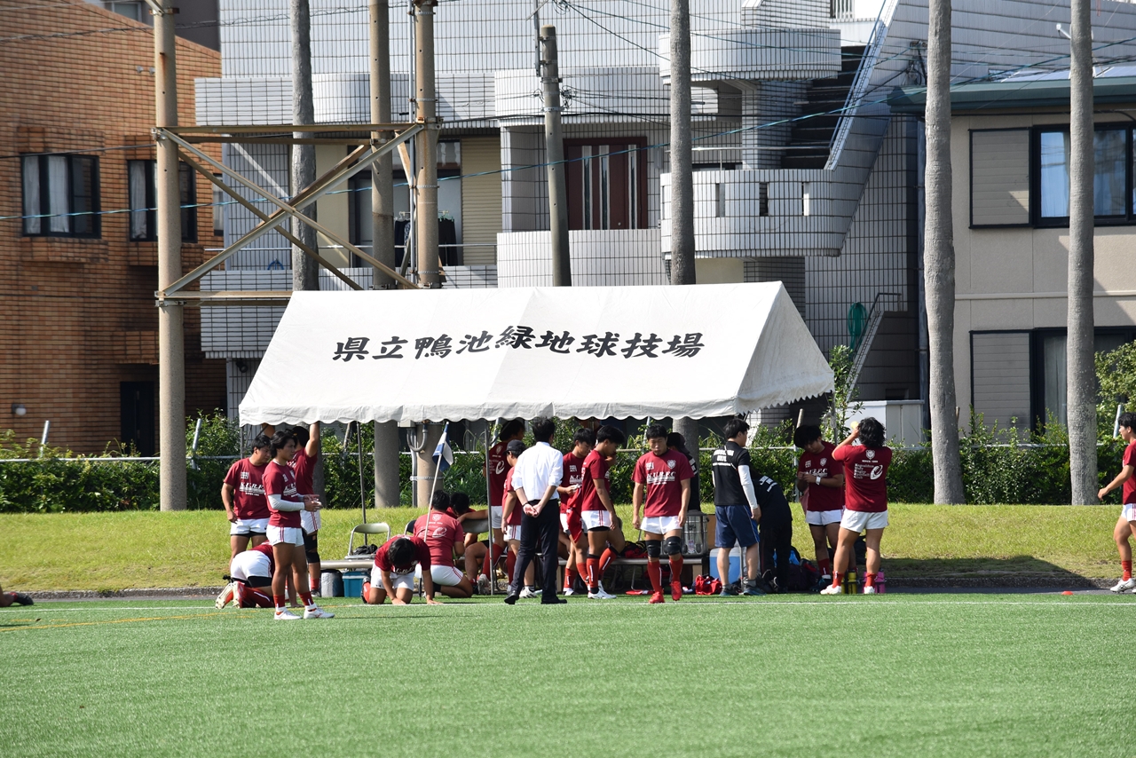 風下での試合開始、開始後相手キックが風にのって伸びゴール前まで攻め込まれ、ゴール前から相手攻撃で先制のトライを取られる、その後も再三相手キックで攻め込まれるが全員一体となった必死のディフェンスで少ないチャンスを生かし2トライ返すが、強風風下でゴールキックすら風で押し戻されるような中、2トライ同士でゴールキック差10-14で前半を折り返す。
