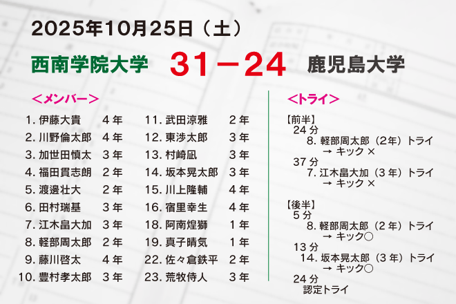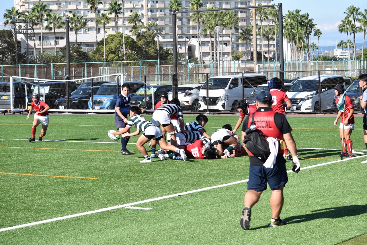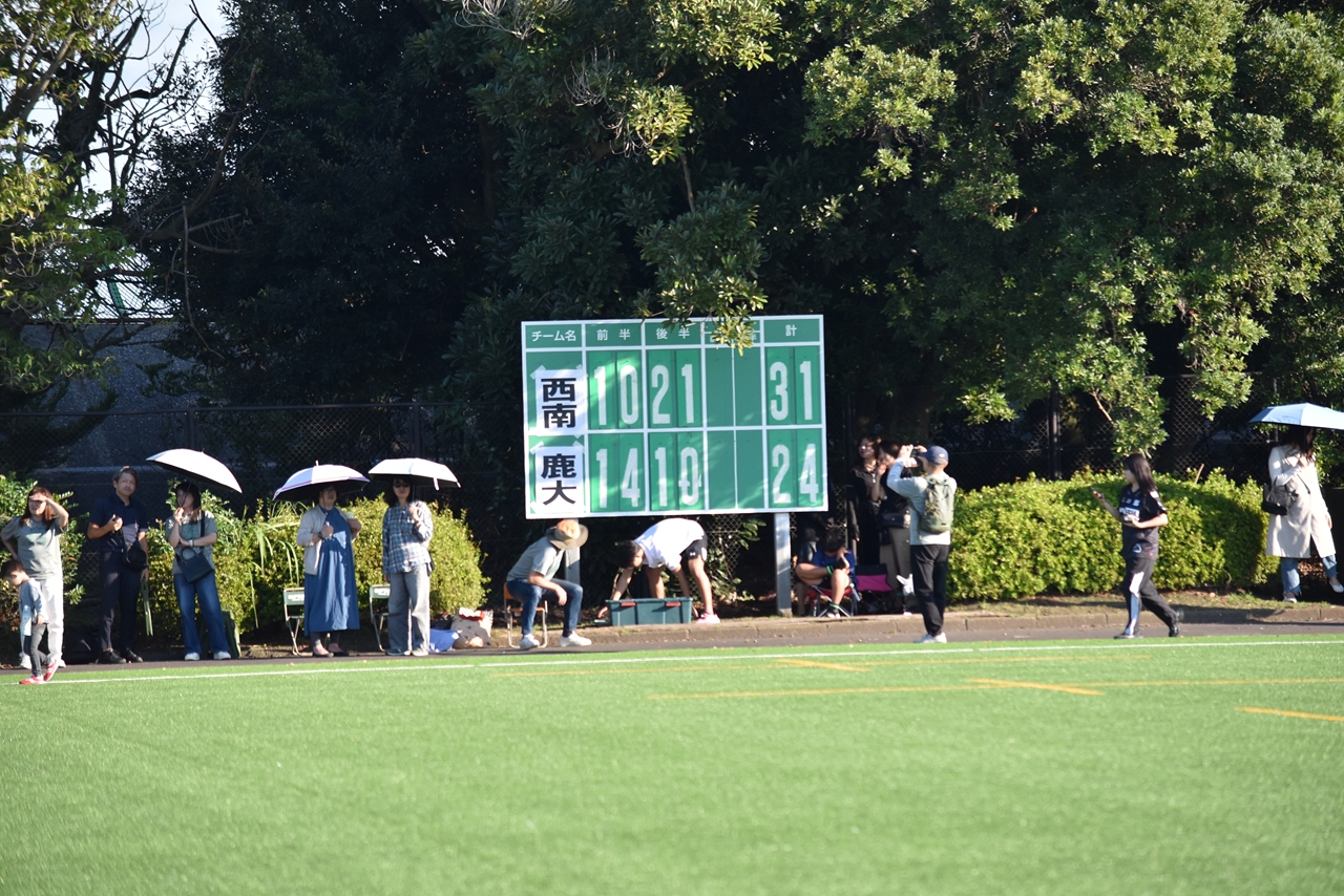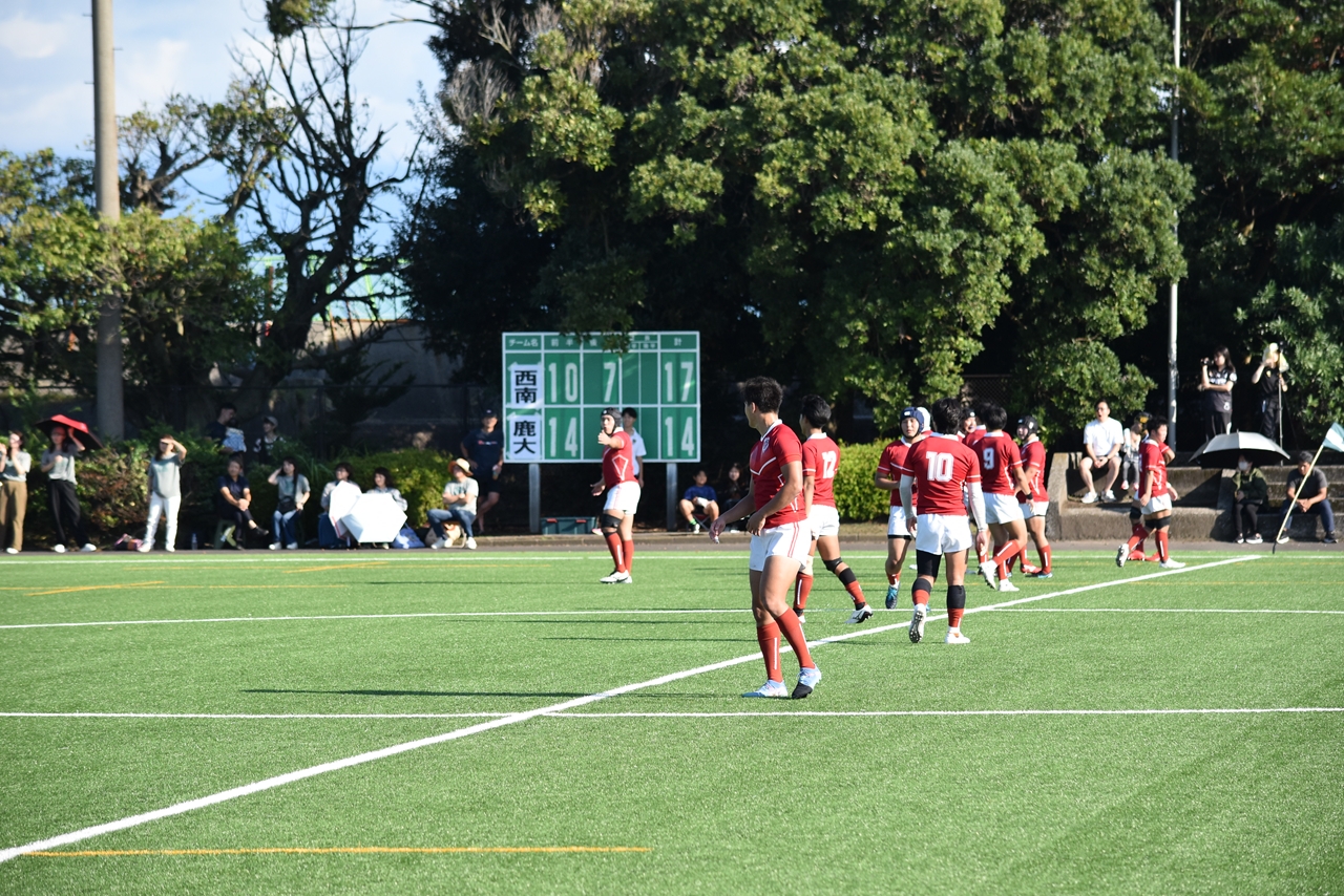 西南大メンバーが複数人交代する中、その後鹿児島大に2トライ巻き返されるが逆転されることなく31対24で逃げ切りました。