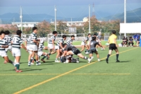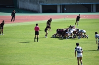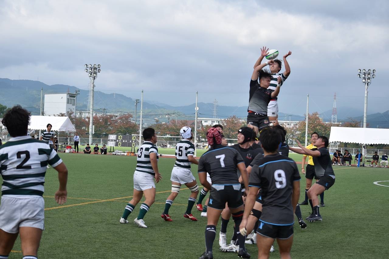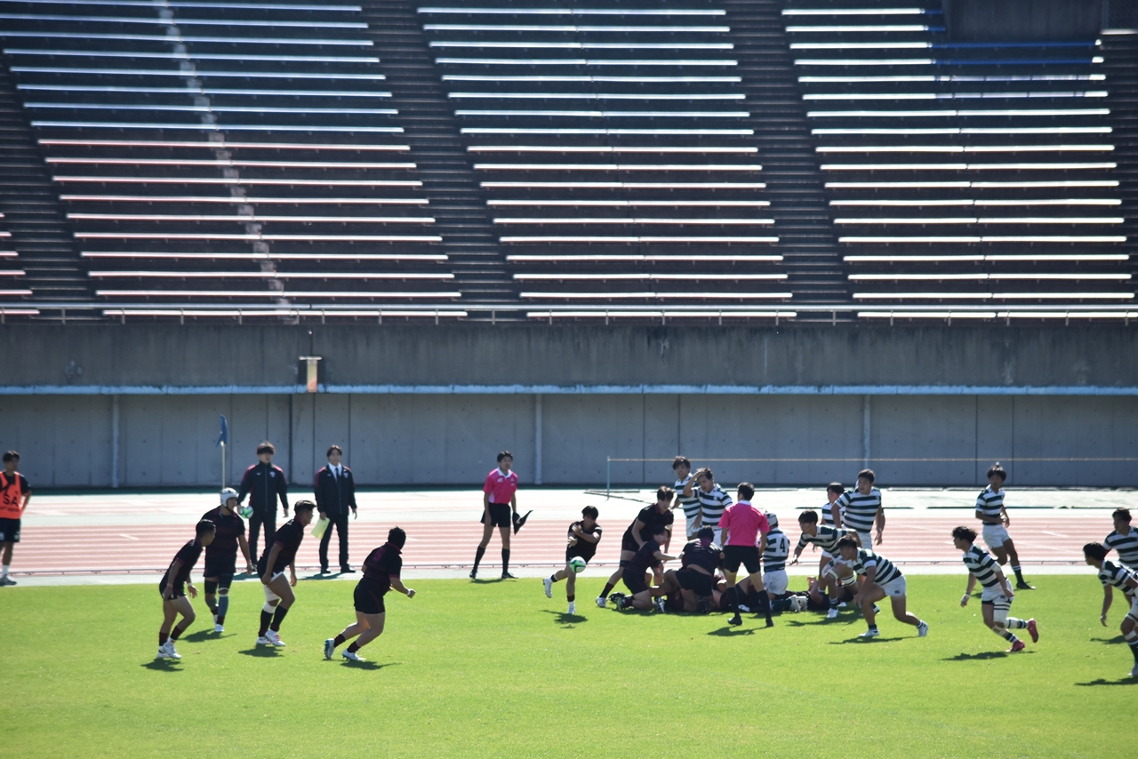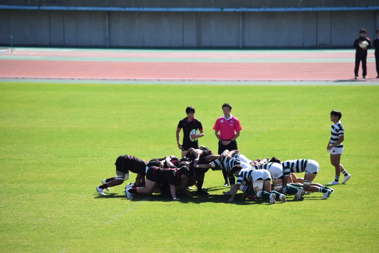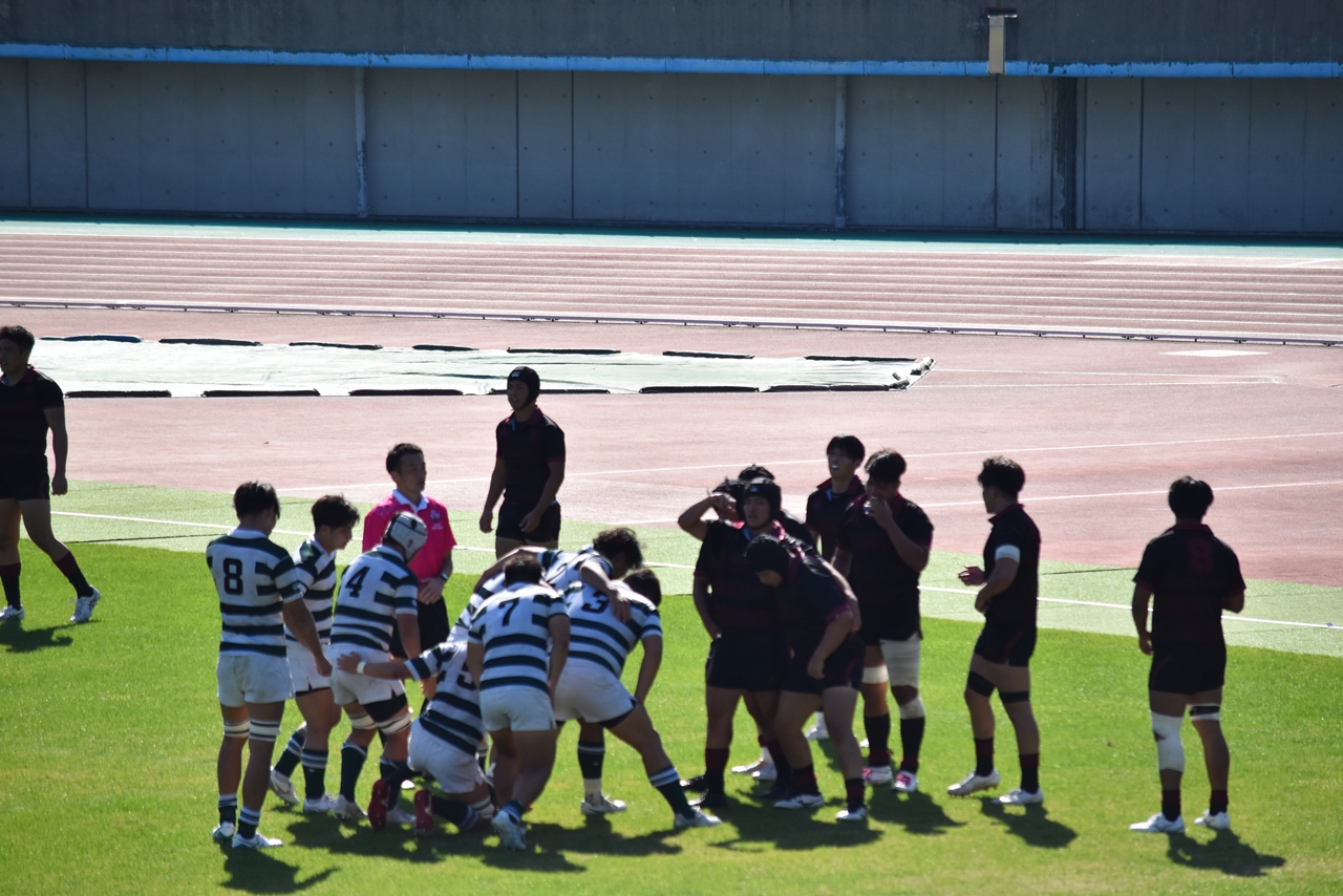 リーグ戦では西南大に惜敗した福岡大学は、キックオフからかなり気合が入った模様、前半開始早々トライを先取する展開、西南大は果敢なディフェンスと粘り強いアタックで相手に主導権を与えない試合展開で前半中盤までは接戦で試合をすすめる、しかし中盤以降左右のウイングまで大きく左右に展開する福大について行けず振り切られ前半を2トライ差で折り返す。